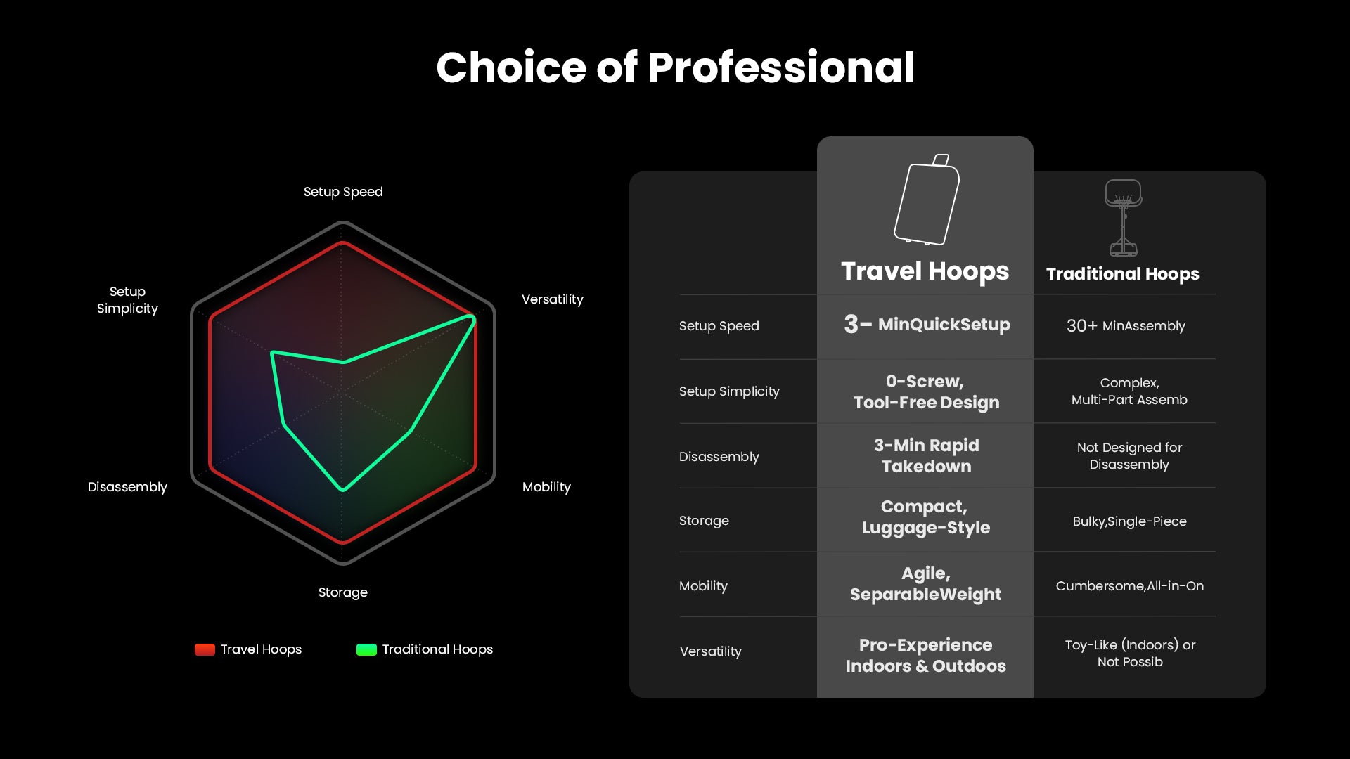 Most basketball hoops are heavy, hard to move, and take ages to set up. They occupy driveway space and can’t be brought indoors at all. Travel Hoop revolutionizes this.In merely minutes, you can build a basketball court anywhere—the driveway, the park, even a bedroom. It folds down to the size of a suitcase, making storage and travel a breeze, so you can play whenever you’re ready. It’s more than a hoop; it’s basketball with no boundaries.